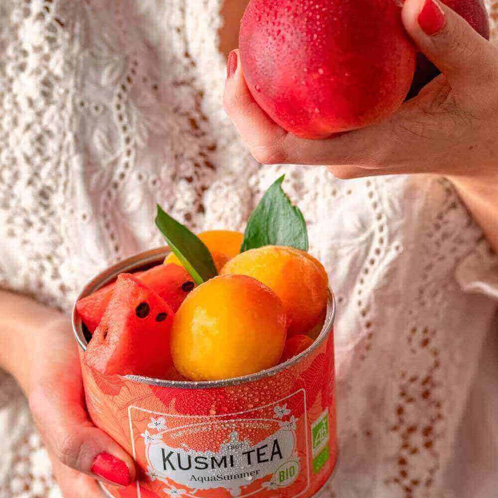Pomme*, hibiscus* (16%), cynorhodon*, pêche* (7%), arôme naturel de pêche (3%), arôme naturel d’abricot (2%) et arôme naturel de pastèque *Produits issus de l’agriculture biologique